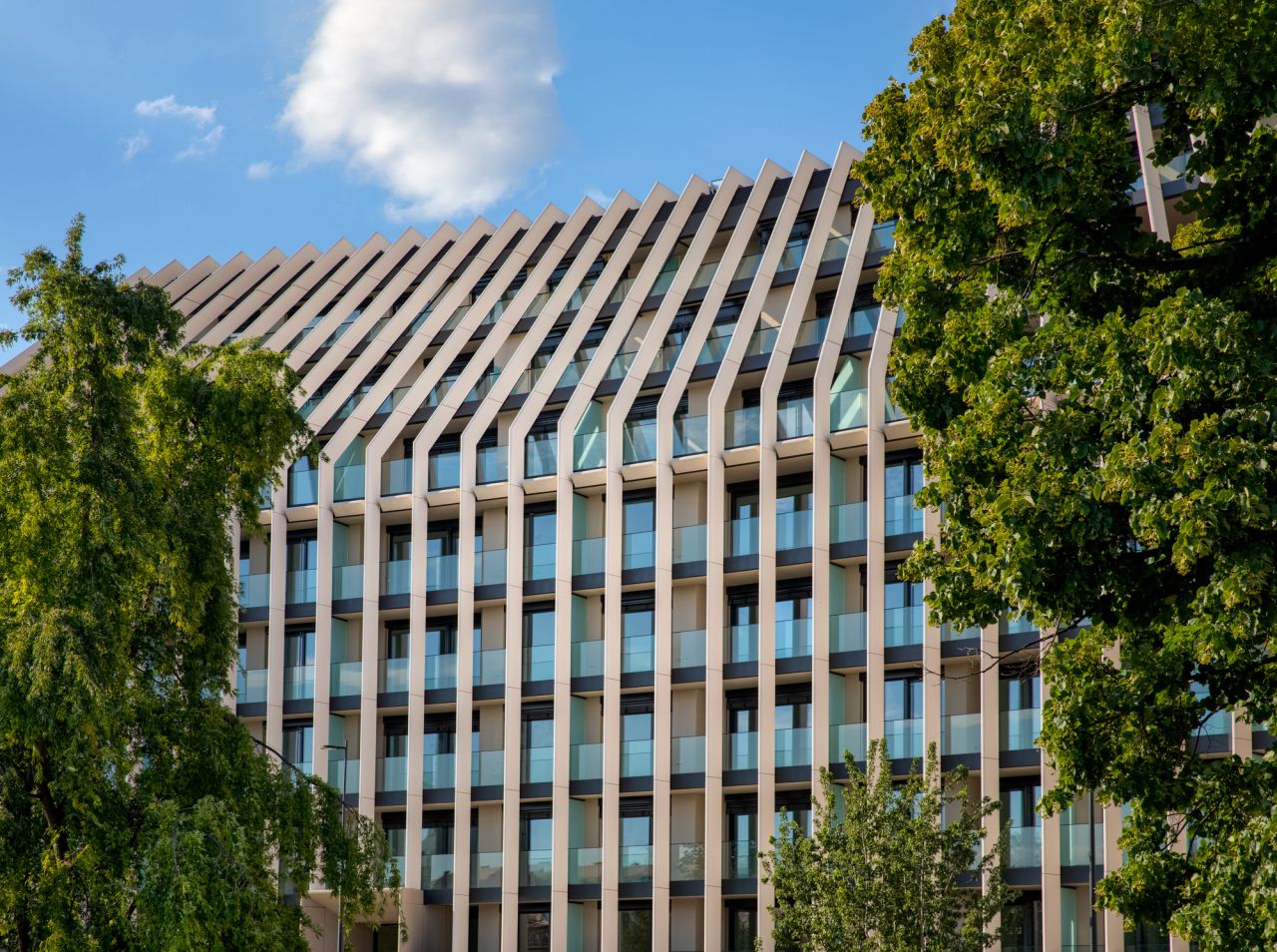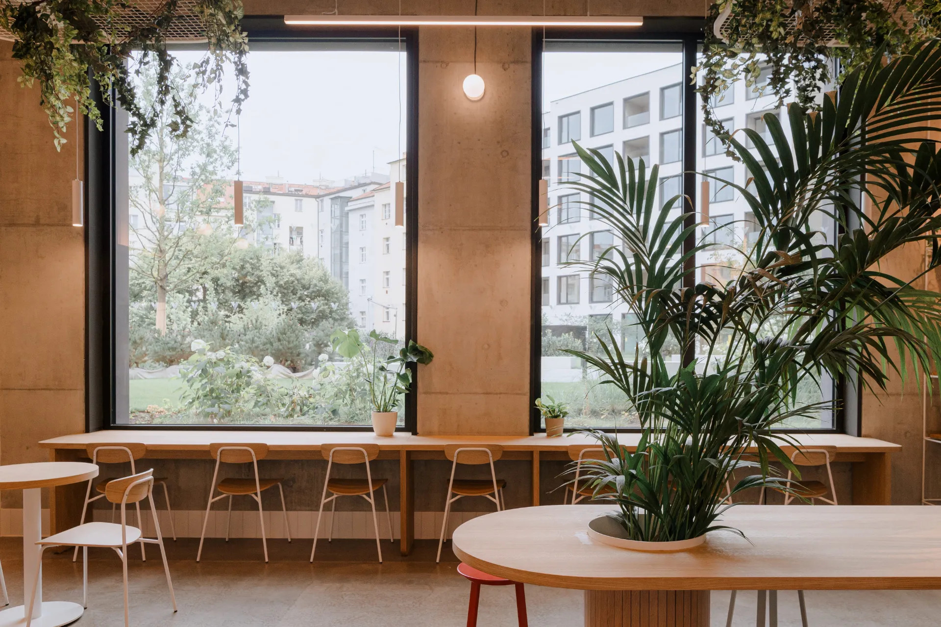 Krásny kaviarensky priestor s výhľadom na zeleň na historicky známom pražskom kulaťáku v priestoroch Victoria Palace.