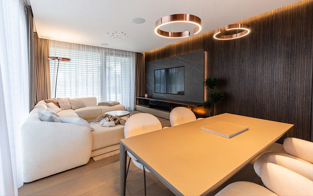 Nadčasový interiér v spojení s inteligentnou inštaláciou KNX. Dizajnové prvky eKinex a grafická nadstavba Control4.